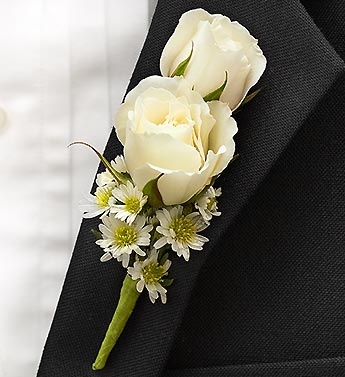 A charming white spray rose and white Monte casino boutonniere makes your youngest “man” in the wedding party look absolutely dashing.