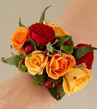 The Sweet Sunshine™ Wristlet is a ray of warm sunshine to honor any of the special women in your life on your wedding day. Red, orange and yellow spray roses are accented with red hypericum berries, lush greens, and topaz rhinestone pics are perfectly arranged on a wristlet covered with a sage grosgrain ribbon for an incredible look. Approximately 5H x 3W.