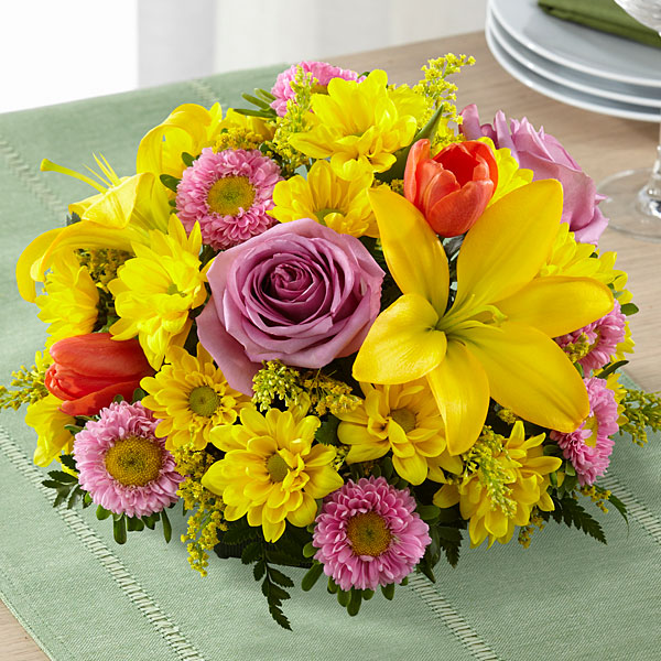 The Spring Sunshine Centerpiece blooms with a bright energy and freshness to help you celebrate throughout the spring months ahead. Brilliant yellow Asiatic lilies, traditional daisies and solidago pop with color and spring charm when combined with orange tulips, pink matsumoto asters, lavender roses and lush greens. This centerpiece will be the perfect addition to your table, gathering friends and family together for Easter, a birthday, or just to celebrate springs long awaited arrival.