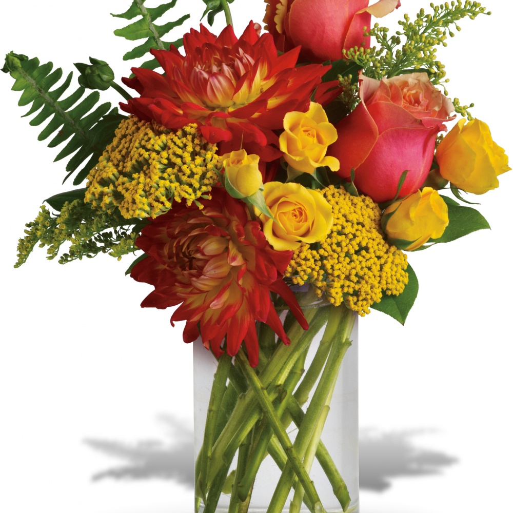As warm and inviting as falling asleep in the sun at the seaside. Bright summer flowers including orange dahlias, yellow spray roses and two-tone orange roses get a tropical twist with the addition of sword fern. Send summer someone’s way today!Orange bi-color roses, yellow spray roses and orange dahlias are mixed with yarrow, solidago, sword fern and salal in a simple cylinder vase.