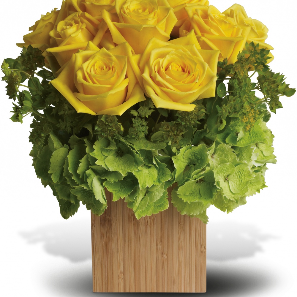 Let the sunshine in! This brilliant mix of flowers is hand-delivered in natural bamboo cube. You can’t help feeling happy and warm all over just by looking at it.Pretty yellow roses rest inside brilliant green hydrangea, all inside an exclusive natural bamboo cube. Imagination blossoms right here!