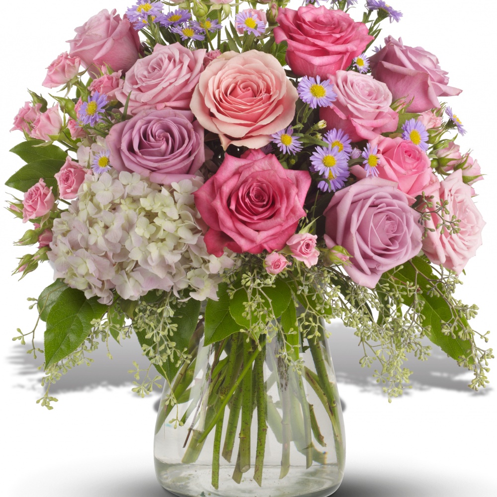 These beautiful pink and lavender roses seem to have a light of their own. Lavish light pink hydrangea adds a sweet softness.
