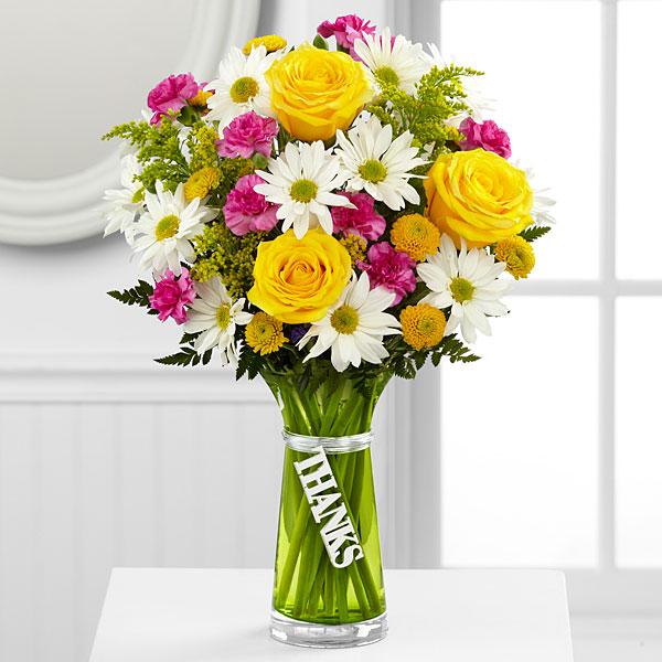 The Thanks Bouquet is a simply gorgeous way to send your gratitude and thanks to friends, family and loved ones near and far! Bright yellow roses are surrounded by white traditional daisies, hot pink mini carnations, yellow button poms and lush greens to create an impressive flower arrangement. Presented in a designer green glass vase with a silver metallic decorative tag stating, Thanks, dangling from the neck, this mixed flower bouquet is a wonderful gift to send as a thank you to any of the deserving people in your life.