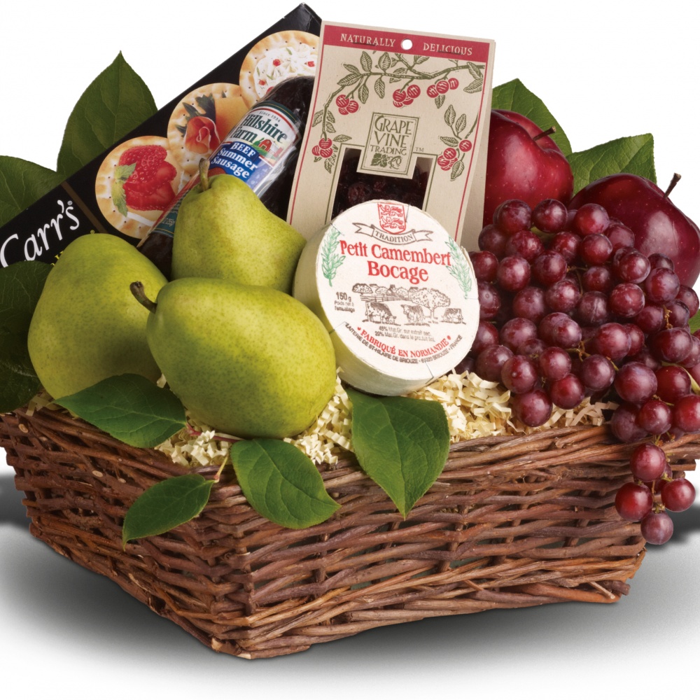 A delicious choice! Send a gift basket of gourmet treats for an instant pick-me-up, any day of the week. This basket of fruit, cheese and crackers is always apropos.Pamper anyone anytime with this gourmet cheese gift basket of grapes, 3 pears, 2 apples, dried cranberries, soft cheese, crackers and summer sausage.