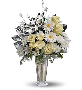 What a delightful way to bring in the New Year! This fun and fabulous arrangement will light up the celebration long past midnight. It’s glittery, glamorous and altogether a great choice. So delightfully different, this bouquet shines with its stunning Mercury Glass Vase, silvery masquerade mask, a spray of silver stars and dazzling white roses, spray roses, miniature gerberas and more.