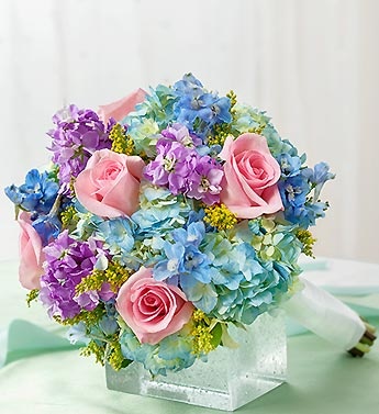 Your bridal attendants' spring ensemble will be perfectly complemented by this artfully designed arrangement featuring pink roses gathered with blue hydrangea, lavender stock and more.