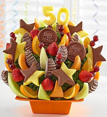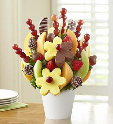 Give them something good to eat with our luscious Fruit Bouquet in a bold orange tray. Any time you want to give them a treat. Juicy strawberries, orange slices, honeydew melon and cantaloupe wedges, half-dipped daisy-shaped pineapple slices, dipped apple wedges rolled in toffee and more. All of our dipped fruit is covered in delicious Fannie May milk chocolaty and pink confections Arrives in a reusable orange tray Measures 14″H x 12″L