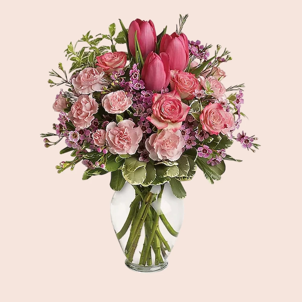 It’s beauty-full! Bursting with tantalizing tulips and radiant roses, this delightful pink arrangement brings spring joy to that special someone.