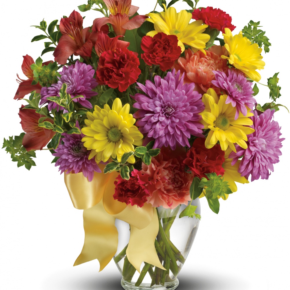 A sweet treat any day of the week! Warm, rich colors of pink and orange are contrasted with fresh green – a welcome combination for any occasion. Send it to sweeten a best friend's birthday, say "hi" to mom, or delight your better half. Lush orange roses, hot pink matsumoto asters and red carnations are accented with bright greenery in a clear glass vase.