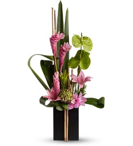 Exotic meets chic. Presented in a black glass cube, this artistic gift features bright, tropical blooms framed by folded red ti leaves. It's an energizing choice for a man or woman. Folded, deep red ti leaves form a decorative collar around yellow cymbidium orchids, red ginger, red roses and yellow roses. Lily grass lends a fresh touch of green.