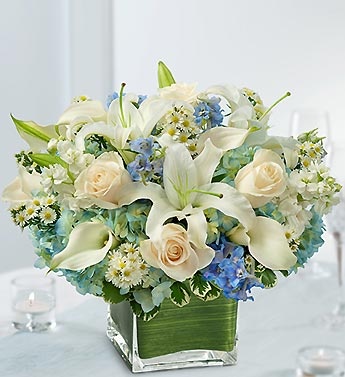 Give your wedding the ultimate touch of luxury with our striking and stylish Purple Elegance centerpiece. A fresh mix of hand-arranged roses, mini calla lilies, dahlias and a variety of fresh blooms are set in a bowl by our expert florists and placed on top of a tall cylinder filled with clear cellophane for a unique frosted look. Gracefully towering over the table, each truly original centerpiece will leave your guests talking about them for days!Elegant, hand-crafted wedding centerpiece of lavender roses, lavender calla lilies, white stock, purple dahlias, lavender lisianthus, foxtail, variegated pittosporum and seeded eucalyptus