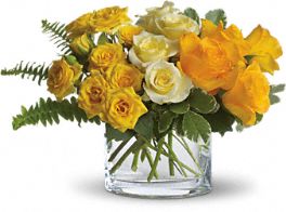 Yellow roses have a modern, tropical feel when mixed with fresh ferns and greenery in a minimalist oval vase. Send this joyful, versatile bouquet any day!