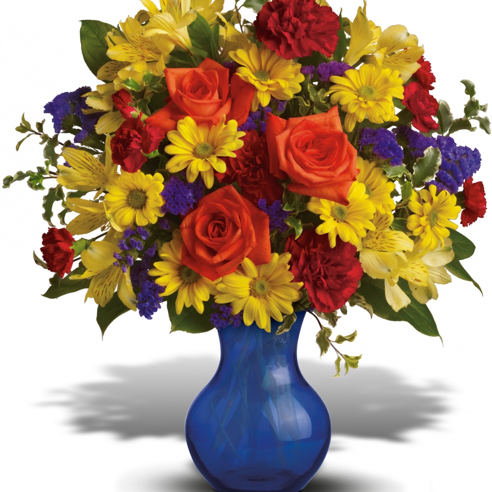 Three cheers for the season’s happiest flowers in a rich cobalt blue vase! Beautifully arranged and beautifully priced, this delightful bouquet makes a brilliant birthday gift. It’s also a great way to say "I’m thinking of you."The bright bouquet includes orange roses, yellow alstroemeria, red carnations and miniature carnations, yellow daisy spray chrysanthemums and purple statice accented with assorted greenery.